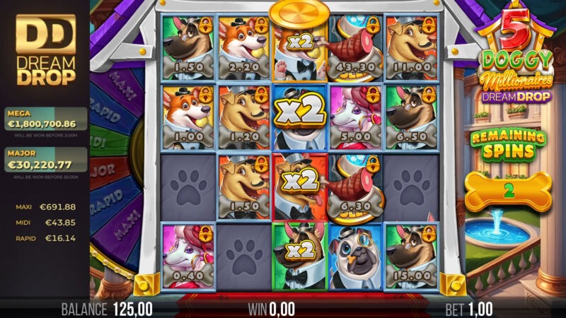 This sequel to the super successful 5 DOGGY DOLLARS features Relax's DREAM DROP JACKPOT System! Spin for 1 of 5 amazing jackpots on the Fortune Wheel: MEGA, MAJOR, MAXI, MIDI, and RAPID!